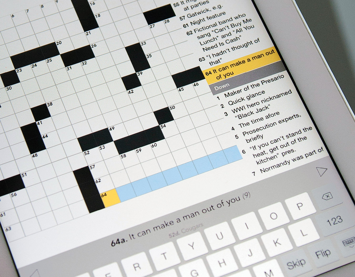 “I guess I’ve always been a puzzle person,” says Quigley, who quit a progression of jobs to puzzle full-time in 2001. “Even in kindergarten, when we were supposed to draw pictures, I just drew intricate mazes.” Attracted by the formal elegance and rigorous structural demands of crosswords, Quigley attached himself to the confessional New Wavers of the puzzle world. He used the stuff of his everyday life, as a twentysomething living in Boston, as clues for his puzzles: beer, bands, and the Bosox made frequent cameos. And along the way, Quigley became something of a crossword celebrity. Now he plays in the Boston Typewriter Orchestra. He has published around 30 crossword books, including 2012’s Sex, Drugs and Rock ’n’ Roll Crosswords, and has, over the years, created more than 1,500 puzzles.