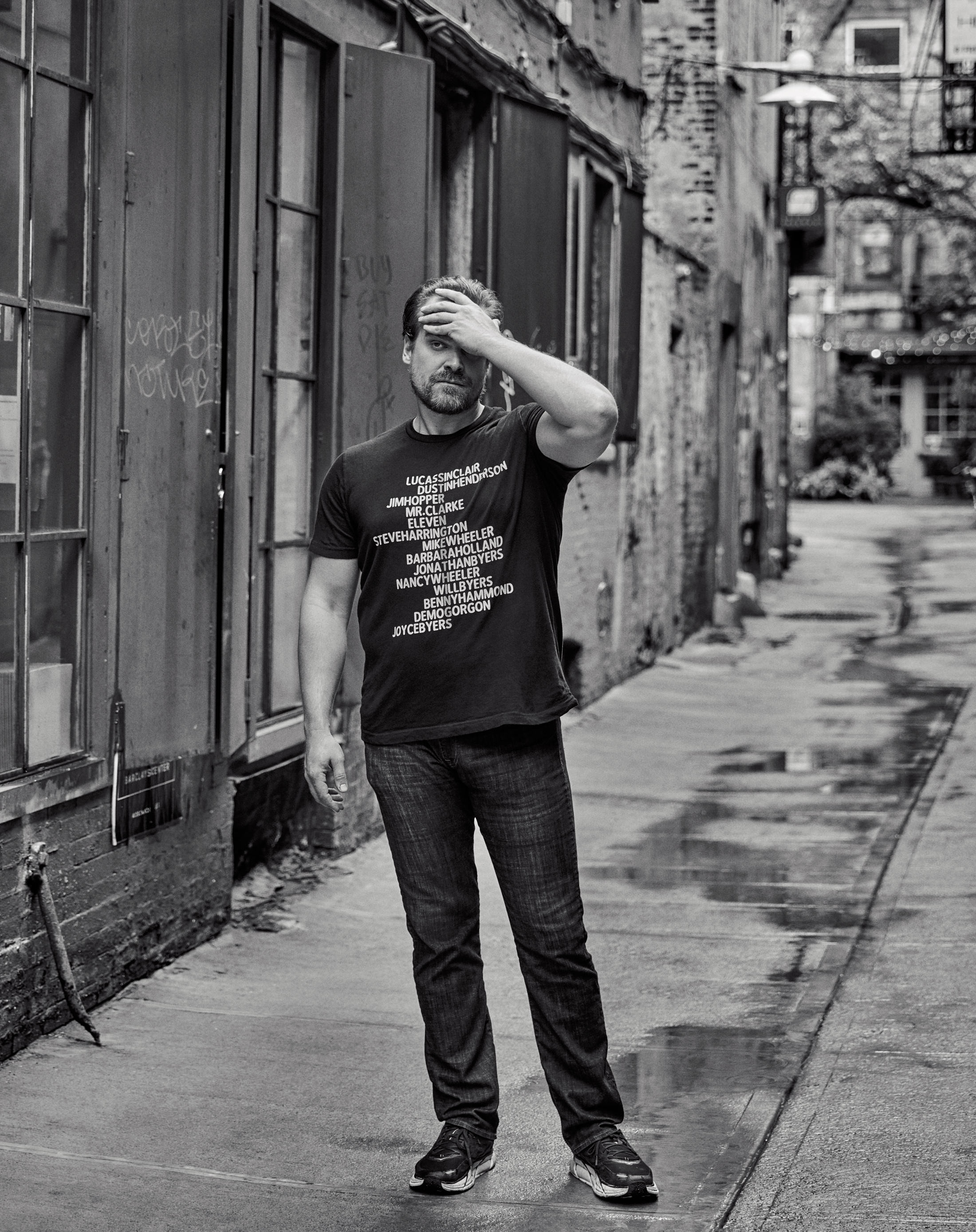 A big man with broad shoulders, deep-set eyes hidden under a baseball cap, and a jawline as thick and square as a dictionary, David Harbour doesn’t just walk down the streets of the East Village, he lumbers. The first time I see him, a sunlit day in late September, that line from the classic American folk tune “Dink’s Song” immediately pops into my head: “She had a man who was long and tall/Moved his body like a cannonball.” Is it the melancholic spillover of the allusion that gives the man an air of world-weary sadness, as if the force of gravity is stronger on him than on the rest of us? Is it that the residue of his breakout role on Netflix’s Stranger Things as police chief Jim Hopper, a decent man who can’t seem to get any breaks, still clings off-screen? Or is it something else?