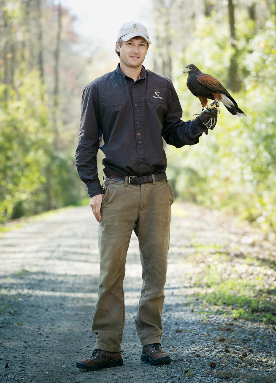 It’s another beautiful day at Broadfield, the 2,300-hectare sporting club at Sea Island resort in the south of Georgia, and Chris Kennedy, a master falconer there, is eyeing the trees. They’re live oaks dripping with Spanish moss, and they form a forest that’s cut by a narrow path—the path Kennedy walks along. Kennedy, a 28-year-old, is pensive. “Falconry,” he says, “is all about patience.” He pauses after a couple of steps to listen for the telltale dull tinker of the tracking bell that’s strapped to the leg of Doyle, a 14-year-old male Harris hawk and one of the six birds he uses to hunt on the estate.