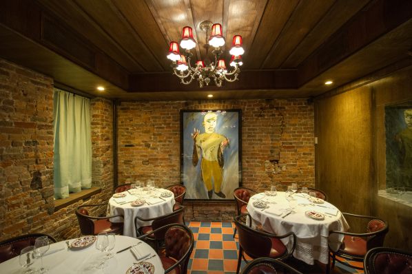 The interior, likewise, has been duped from a mid-century Italian-American restaurant. The footprint of Rocco, a warren of small rooms, is intact. The floors are tile; the ceilings are tin. Roosters are frozen mid-crow on the terra cotta plates. There are white tablecloths with lace.