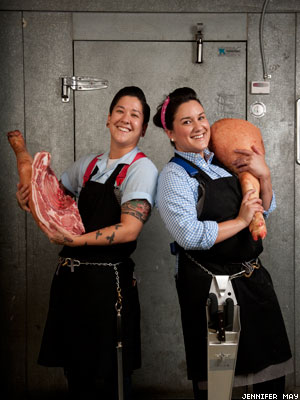 These were questions faced by Erika Nakamura (above left) and Amelia Posada -- the partners behind Lindy & Grundy's, a new Los Angeles butcher shop focusing on local and sustainable meats -- when they planned their nuptials in Santa Barbara, Calif., last year. Nakamura, a Tokyo-born, L.A.-raised sculptor and chef, and Posada, a Mexican-American community activist'cum'floral designer, were committed to entertaining their 125 guests in the most sustainable way they could. Instead of the standard wedding fare of filet mignon or New York strips, the happy couple chose to use the entire rib and loin section of one steer. 'Two tables got burgers, two got ribs, two got hash,' says Nakamura. 'It was completely sustainable. Amelia and I even butchered the beef two days before.'